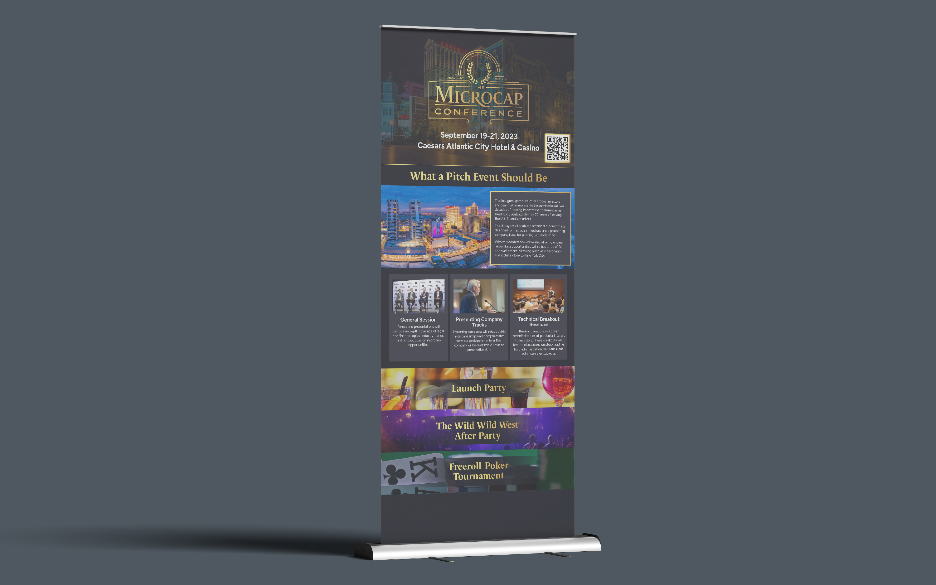 The Microcap Conference is a congregation of deal-makers and microcap investors. Taking inspiration from Caesars Atlantic City Hotel, where the conference was held, I designed the logo and created promotional materials optimized for both desktop and mobile displays. Additionally, I designed a roll-up banner for display at the conference venue.